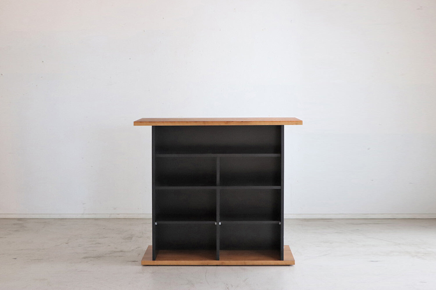 前面はマガジンラック(黒塗装)で魅せる収納。裏面はボトルやグラス、バー小物をしまえる大容量シェルフで実用性◎。