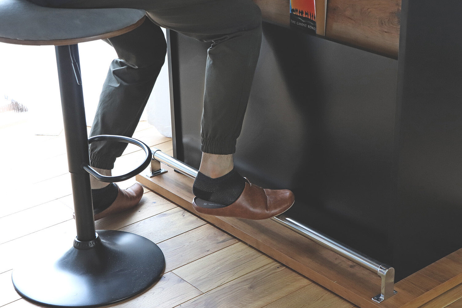カウンター高105cmのハイ仕様+ステンレス足置きで姿勢が安定。高見えしつつ足元も快適です。