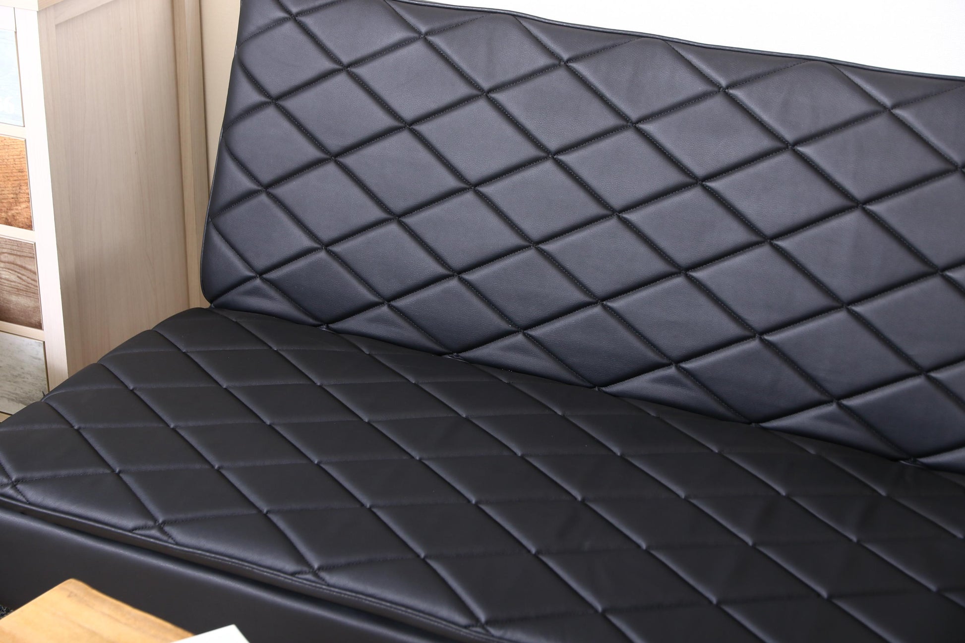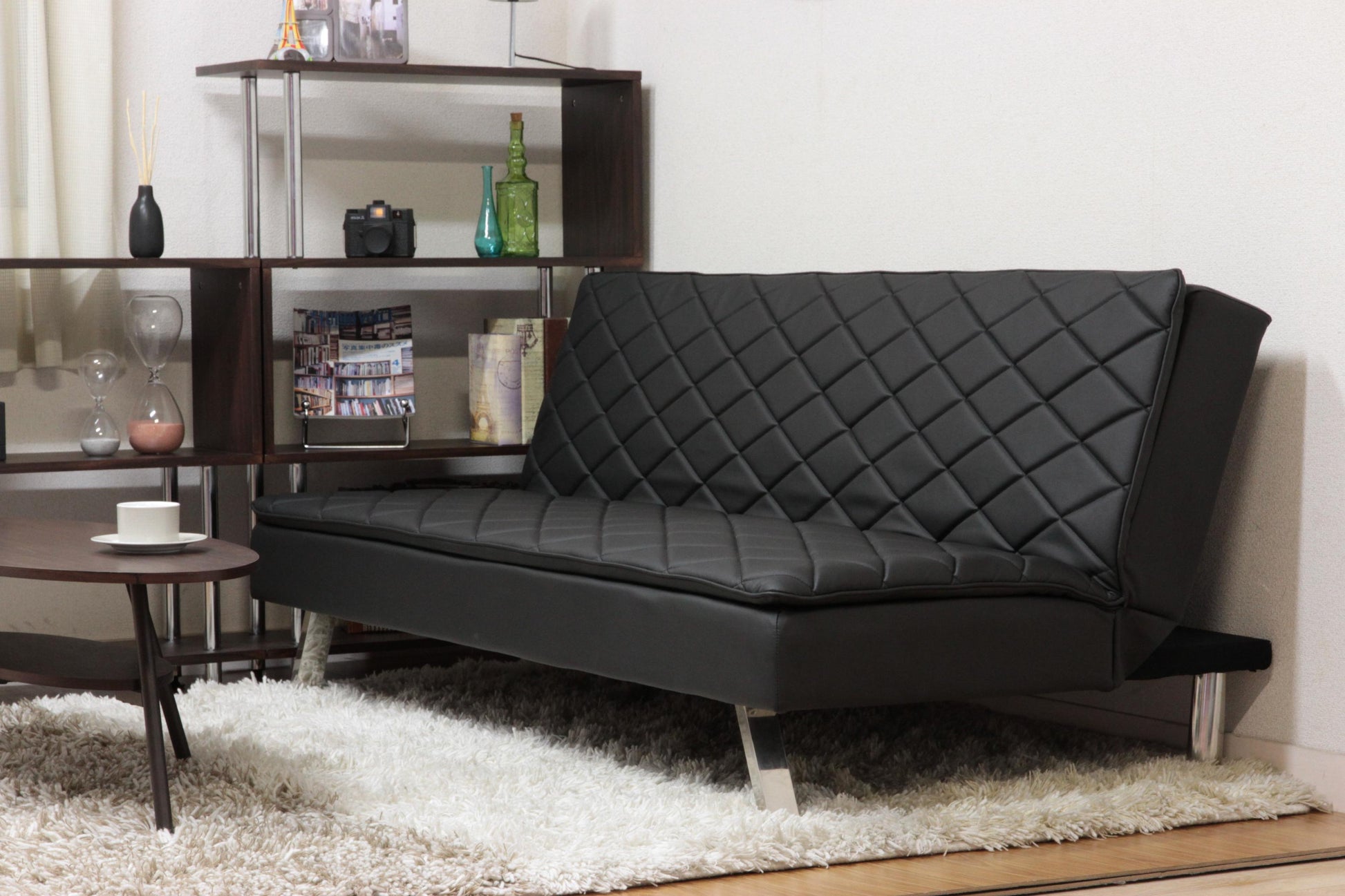 合成皮革(PU)×ブラックのミニマルデザイン。生活感を抑え、黒〜グレー基調の空間にマッチします。